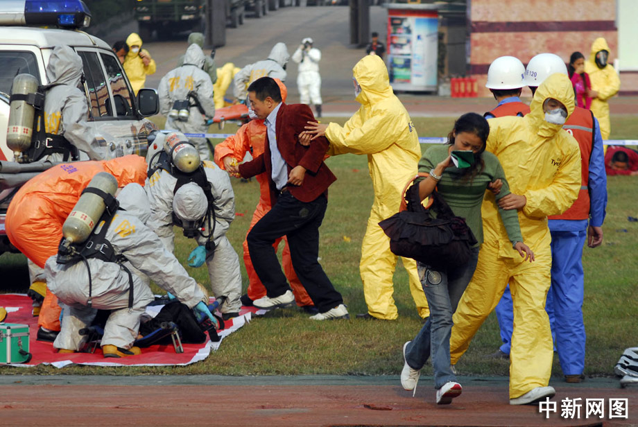 緊隨其后進(jìn)場(chǎng)的是防化醫(yī)學(xué)救援隊(duì)。該分隊(duì)指揮員帶領(lǐng)后續(xù)偵察分隊(duì)、洗消分隊(duì)和化驗(yàn)組,分別乘坐4輛防化偵察車、1輛淋浴車和1輛防化化驗(yàn)車入場(chǎng)。穿藍(lán)色和橙色防護(hù)服的防化醫(yī)學(xué)救援隊(duì)入場(chǎng)后,醫(yī)療衛(wèi)生人員迅速展開(kāi)裝備,組織檢驗(yàn)監(jiān)測(cè),開(kāi)設(shè)臨時(shí)醫(yī)療所,區(qū)分觀察區(qū)、檢診區(qū)、洗消區(qū)和處置區(qū),救護(hù)車開(kāi)始中毒人員轉(zhuǎn)運(yùn)。 郝飛 攝