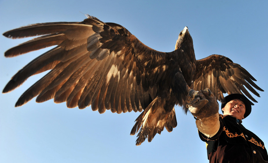10月30日,在吉爾吉斯斯坦Bokonbayevo傳統(tǒng)的狩獵節(jié)上,一只捕獵鳥在追獵物。