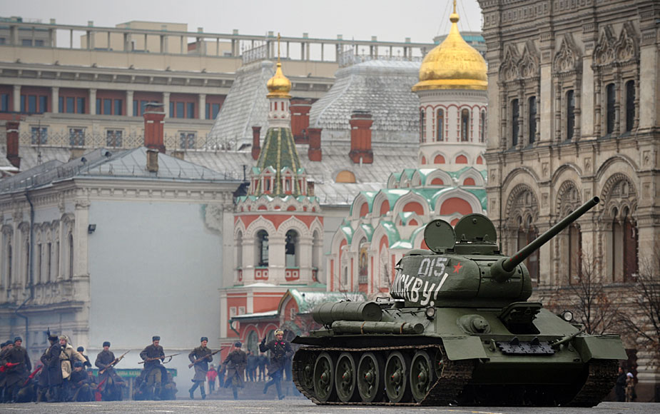 11月7日,俄羅斯士兵身穿二戰(zhàn)時(shí)期的軍服在莫斯科紅場舉行閱兵閱兵式紀(jì)念1941年紅場閱兵。圖片來源:中國新聞網(wǎng)