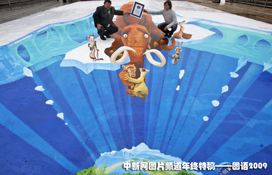 世界最大的3D立體畫:11月23日,德國街頭畫家埃德加·穆勒在英國倫敦一家購物中心展示他以動(dòng)畫電影《冰河時(shí)代3》為主題創(chuàng)作的大型立體畫。這幅立體畫占地320平方米,創(chuàng)造了新的吉尼斯世界紀(jì)錄,給人們帶來妙趣橫生的視覺體驗(yàn)。圖片來源:中國新聞網(wǎng)
