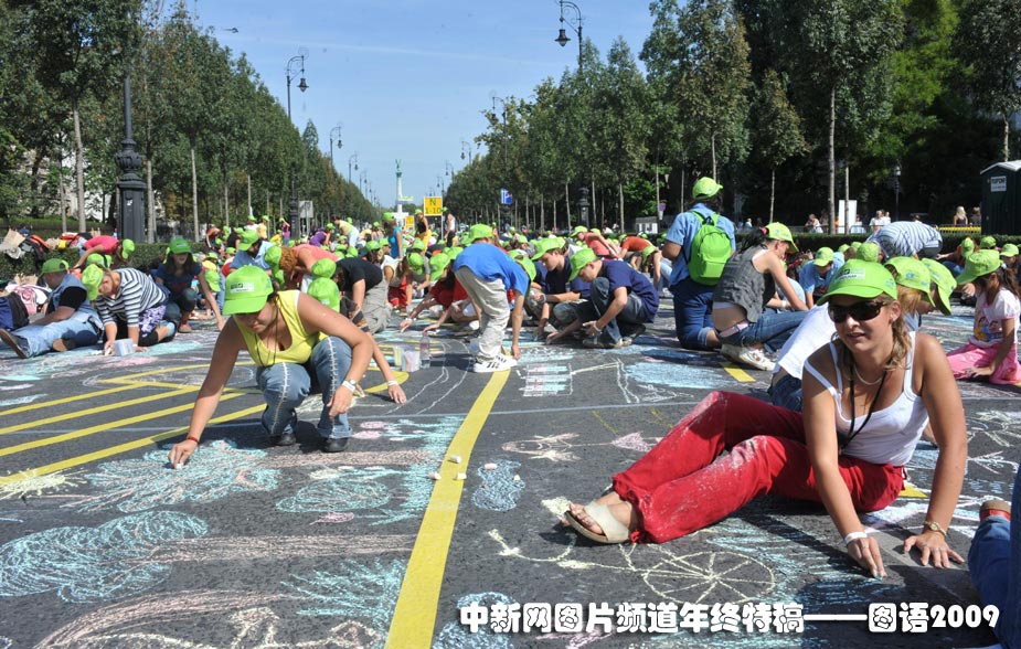 最多參加的粉筆畫(huà):9月20日,世界無(wú)車(chē)日,在匈牙利首都布達(dá)佩斯的一條街道上5317人同時(shí)參加粉筆畫(huà)制作,打破了以前的吉尼斯世界紀(jì)錄。圖片來(lái)源:中國(guó)新聞網(wǎng)