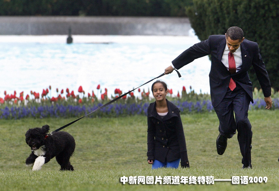 4月14日,美國總統(tǒng)奧巴馬一家在白宮南草坪遛狗。