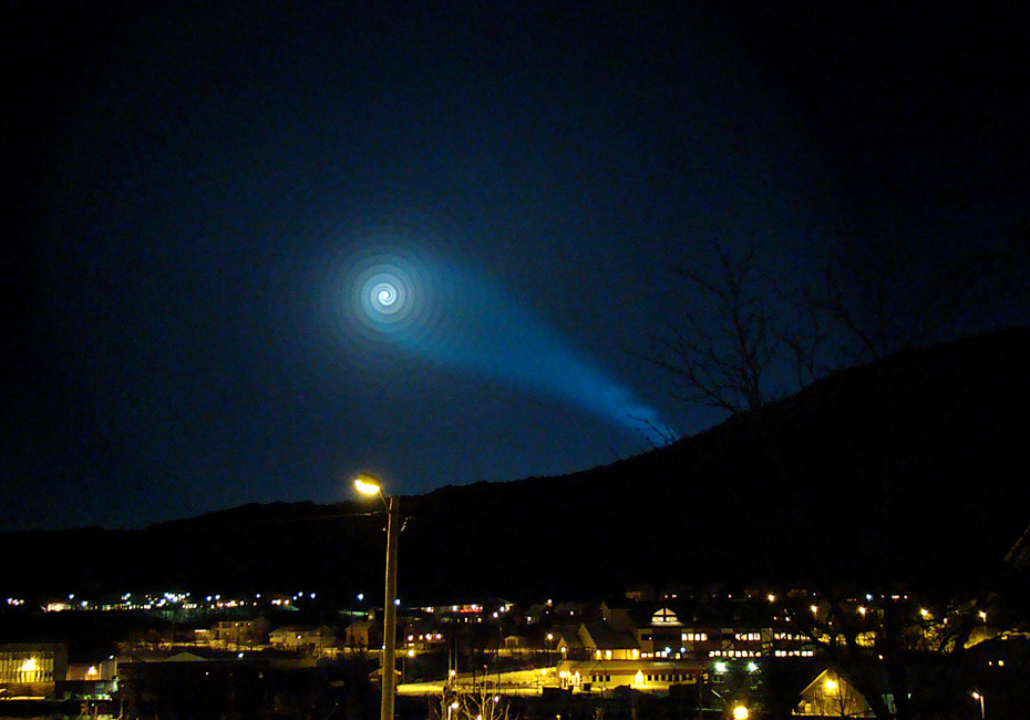 12月9日,挪威北部特羅姆瑟市上空發(fā)現(xiàn)不明“藍(lán)色發(fā)光螺旋狀”現(xiàn)象。圖片來源:中國新聞網(wǎng)