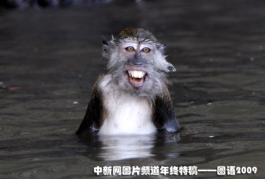 馬來(lái)西亞的一個(gè)地質(zhì)公園內(nèi),一只長(zhǎng)尾獼猴在水中“大笑”。