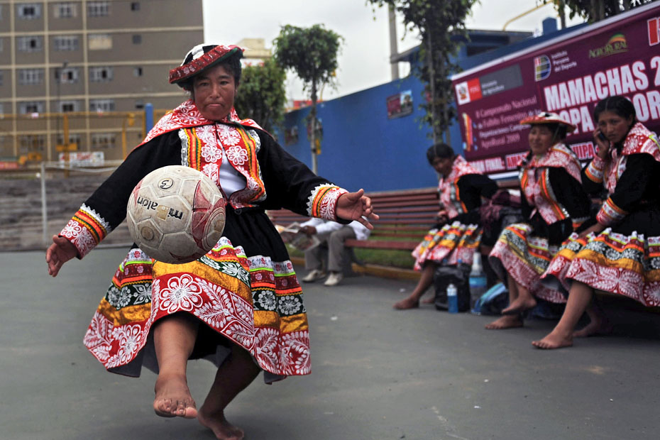12月12日,秘魯印第安婦女在利馬國家體育場外舉辦了一場特別的足球賽,所有的球員均身著傳統(tǒng)服飾光腳上陣妙趣橫生。圖片來源:中國新聞網