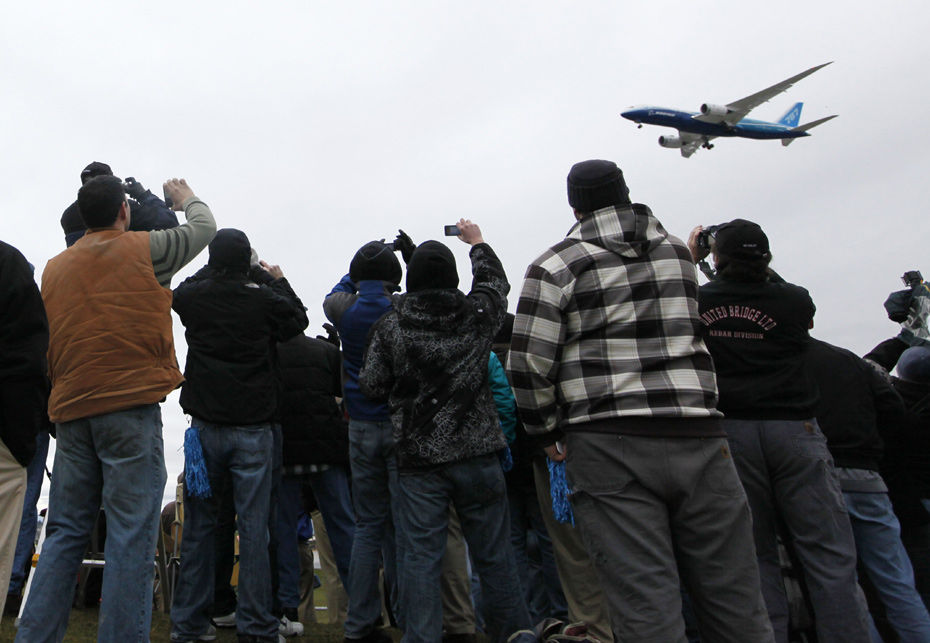 12月15日,延遲兩年多之后,美國波音公司最新夢幻客機波音787終于在華盛頓州升空試飛,兩萬五千多人忍受寒冷觀看了試飛過程。來源:中國新聞網(wǎng)