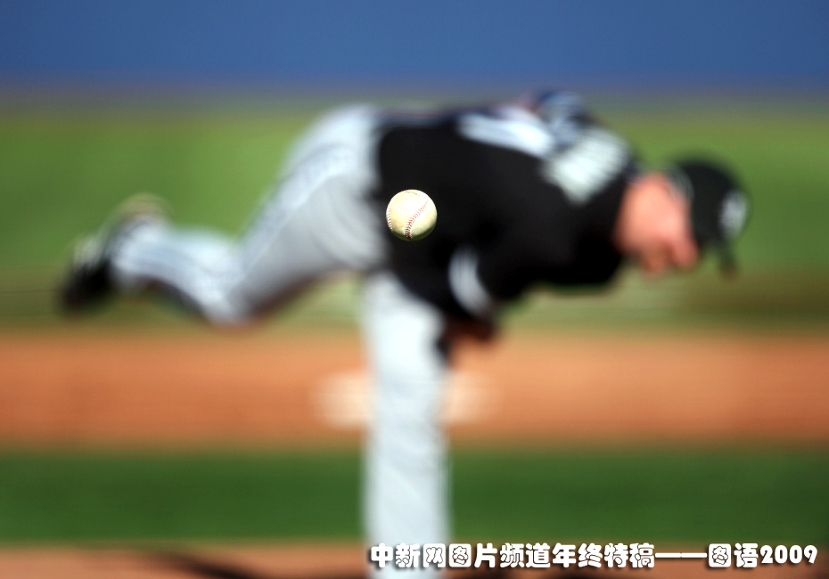 美國(guó)棒球聯(lián)賽上,投手將球投出的瞬間。