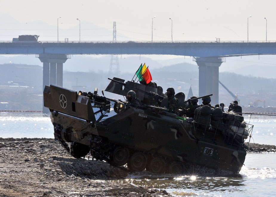 12月16日,韓國第20師團機械化部隊在京畿道驪州南漢江一帶進行大規(guī)模渡河實戰(zhàn)訓練。該訓練以培養(yǎng)戰(zhàn)斗執(zhí)行能力為重點。圖片來源:中國新聞網(wǎng)