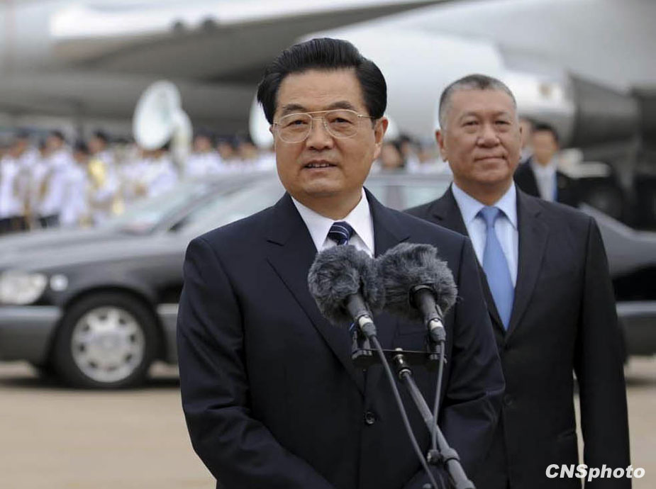 12月19日中午,中共中央總書記、國家主席、中央軍委主席胡錦濤乘專機抵達澳門并在機場發(fā)表講話。中新社發(fā) 廖攀 攝