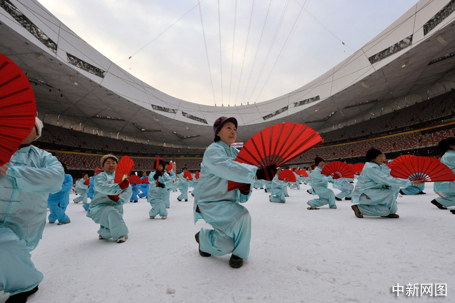 2010年1月1日上午,2010人在被冰雪覆蓋的鳥巢內(nèi)表演了太極拳、武功扇等民族傳統(tǒng)健身項目。中新網(wǎng)記者 金碩 攝