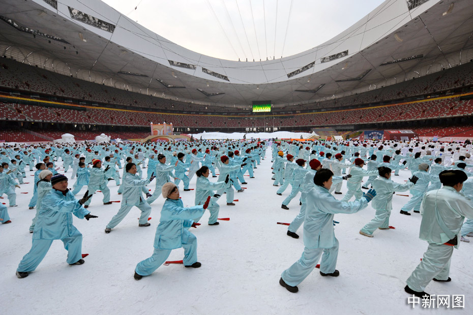 2010年1月1日上午,2010人在被冰雪覆蓋的鳥巢內(nèi)表演了太極拳、武功扇等民族傳統(tǒng)健身項目。中新網(wǎng)記者 金碩 攝
