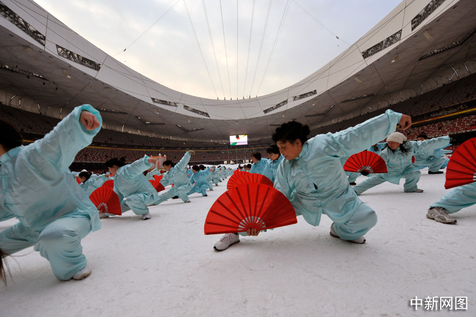 2010年1月1日上午,2010人在被冰雪覆蓋的鳥巢內(nèi)表演了太極拳、武功扇等民族傳統(tǒng)健身項(xiàng)目。中新網(wǎng)記者 金碩 攝