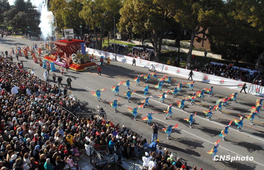 美國當(dāng)?shù)貢r間1月1日,第121屆美國玫瑰花車大游行在加州帕薩迪納市隆重舉行。著名影星成龍助陣中國上海世博花車。圖片來源:中國新聞網(wǎng)