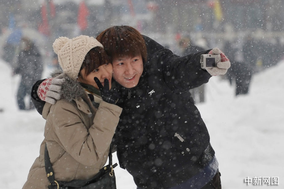1月3日,一對(duì)情侶在時(shí)剎海冒雪合影。中新網(wǎng)記者 金碩 攝