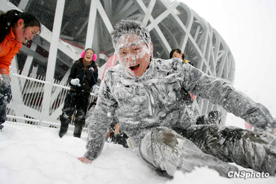1月3日,北京城降下大雪,北京地區(qū)氣溫逼近40年來(lái)的歷史低溫極值。圖為年輕人在鳥巢旁打雪仗。中新社發(fā) 富田 攝