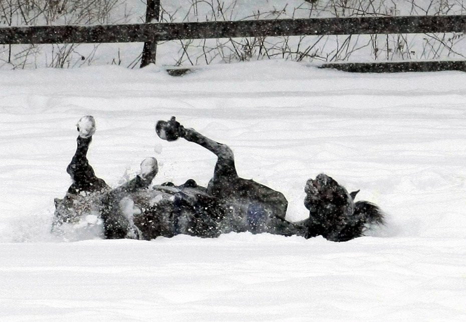 1月5日,美國俄亥俄州,一匹馬在雪地上“撒野”。