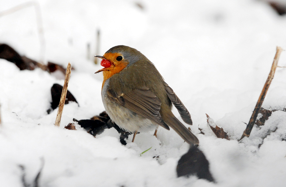 1月5日,德國(guó),一只知更鳥(niǎo)正在吃著大餐欣賞雪景。