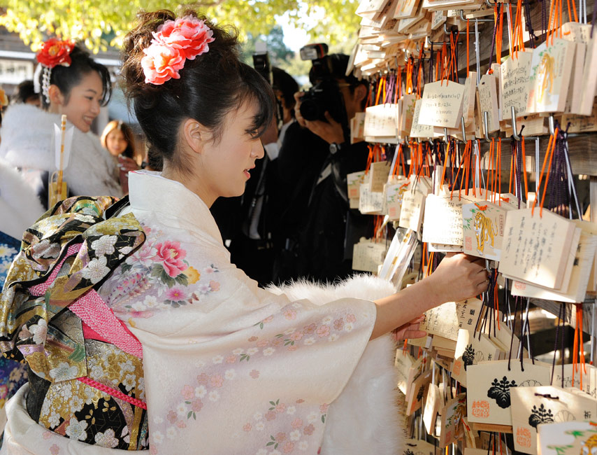 今年的1月11日,是日本傳統(tǒng)的成人節(jié),所有滿20歲的年輕人將宣告自己邁進(jìn)了成人行列。1月8日,日本一家公司年滿20歲的年輕女孩紛紛穿上和服,到廟宇中祈福,提前慶祝成人節(jié)的到來(lái)。