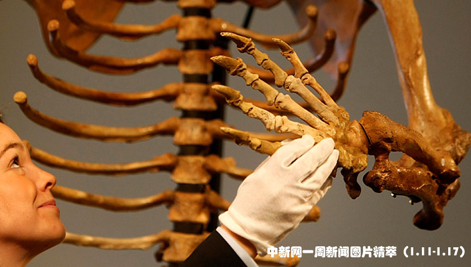 1月11日(周四),在倫敦,Bonhams拍賣行的工作人員正在查看一只冰河時(shí)期巨型熊的骨骼,其年代大約可追溯到5,000萬年前。這具骨骼有望拍得3萬至4萬美元。圖片來源:中國(guó)新聞網(wǎng)