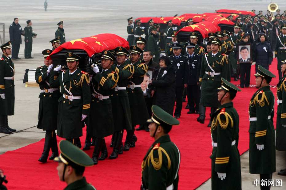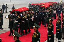 1月19日上午,在海地地震中犧牲的八位中國維和警察遺體回國接機(jī)儀式在北京首都機(jī)場舉行。中新社記者 富田 攝