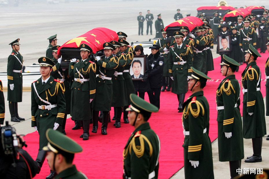 1月19日上午,在海地地震中犧牲的八位中國(guó)維和警察遺體回國(guó)接機(jī)儀式在北京首都機(jī)場(chǎng)舉行。中新社記者 富田 攝