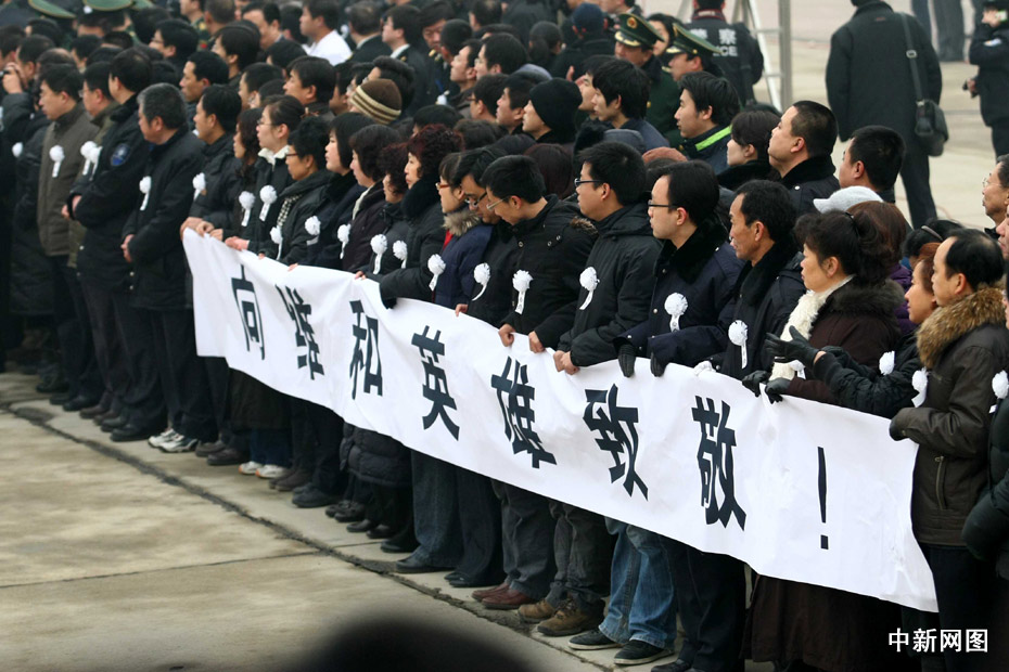 1月19日上午,在海地地震中犧牲的八位中國維和警察遺體回國接機儀式在北京首都機場舉行。中新社記者 富田 攝