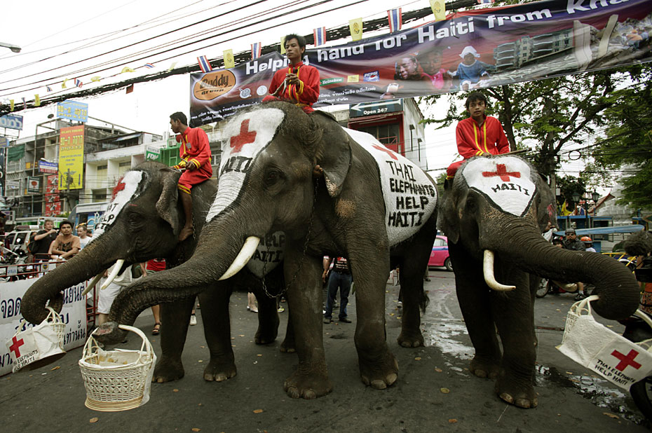 1月21日,在泰國首都曼谷舉辦了一場(chǎng)大象為海地災(zāi)區(qū)募捐活動(dòng)。人們紛紛向大象攜帶的籃子內(nèi)放入善款,向海地地震幸存者獻(xiàn)上一份愛心。圖片來源:中國新聞網(wǎng)
