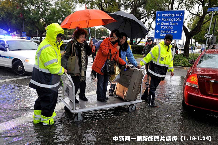 1月20日,在近期遭受暴風(fēng)雨襲擊的加州長(zhǎng)灘地區(qū),捷藍(lán)航空公司工作人員幫助乘客穿過(guò)被水淹沒(méi)的機(jī)場(chǎng)停車場(chǎng)。圖片來(lái)源:中國(guó)新聞網(wǎng)
