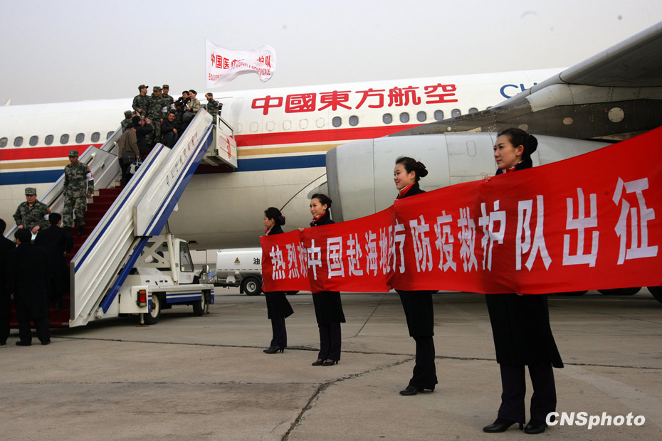 1月24日18時(shí),由中國(guó)人民解放軍醫(yī)護(hù)人員和管理人員組成的中國(guó)醫(yī)療防疫救護(hù)隊(duì)一行40人乘坐軍運(yùn)包機(jī)離開北京,啟程前往海地進(jìn)行人道主義救援任務(wù)。