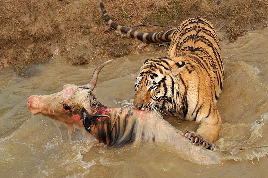但水中的牦牛一動(dòng)彈,更加激發(fā)了老虎的野性,這時(shí)有三、四只老虎撲了上來(lái),工作人員拼命往水塘邊上拽牦牛,無(wú)奈一只虎王一下就咬住了牦牛的脖子怎么都不肯松口,繼而上演了人和老虎的“拔河比賽”。