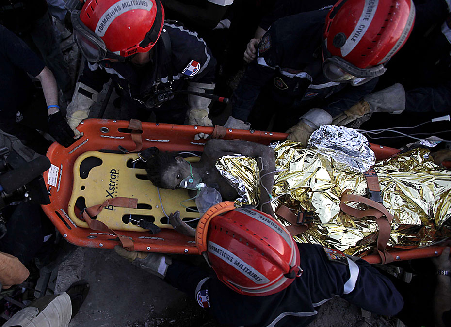 2010年1月27日,海地太子港,法國(guó)救援人員在一棟房屋的廢墟下救出被困15天的16歲女孩黛琳娜·艾提尼(Daline Etienne)。女孩微弱的話語讓大家著實(shí)吃驚:她竟是憑著隨身的可樂挺了過來。圖片來源:中國(guó)新聞網(wǎng)