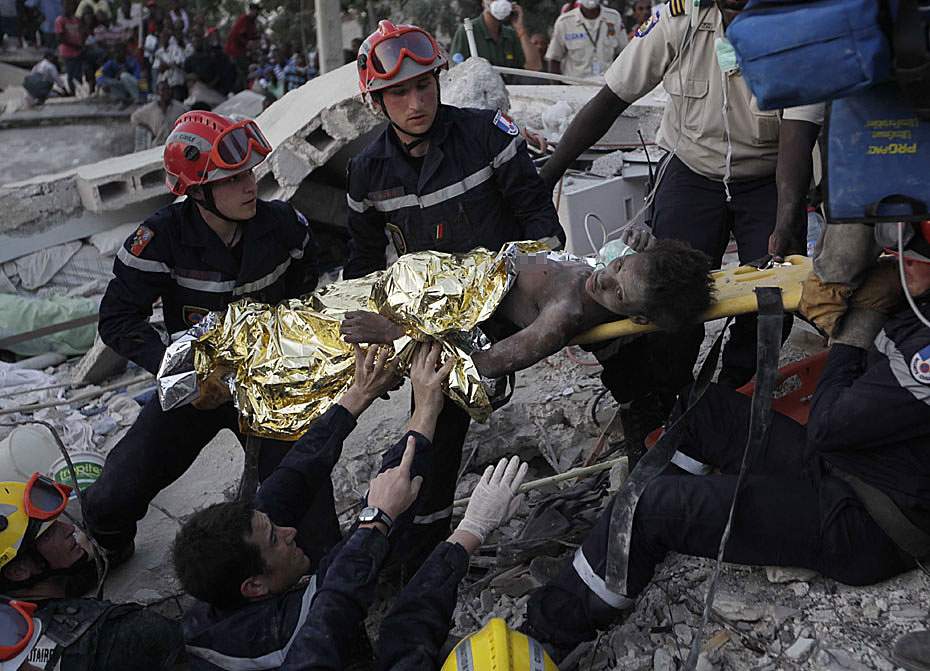 2010年1月27日,海地太子港,法國救援人員在一棟房屋的廢墟下救出被困15天的16歲女孩黛琳娜·艾提尼(Daline Etienne)。女孩微弱的話語讓大家著實吃驚:她竟是憑著隨身的可樂挺了過來。圖片來源:中國新聞網(wǎng)