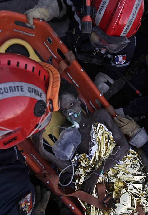 2010年1月27日,海地太子港,法國(guó)救援人員在一棟房屋的廢墟下救出被困15天的16歲女孩黛琳娜·艾提尼(Daline Etienne)。女孩微弱的話(huà)語(yǔ)讓大家著實(shí)吃驚:她竟是憑著隨身的可樂(lè)挺了過(guò)來(lái)。圖片來(lái)源:中國(guó)新聞網(wǎng)