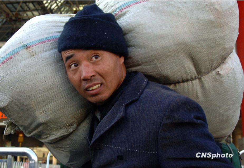 一年一度的春運(yùn)今日起正式開始。2010年的春運(yùn)從1月30日起至3月10日,為期40天,其中節(jié)前15天,節(jié)后25天。據(jù)權(quán)威預(yù)測(cè),今年春運(yùn)客運(yùn)量料超25億人次。 1月30日,北京西站廣場(chǎng)上,一名中國民工扛著行囊和打工的收獲,返鄉(xiāng)過節(jié)。中新社發(fā) 鄒憲 攝