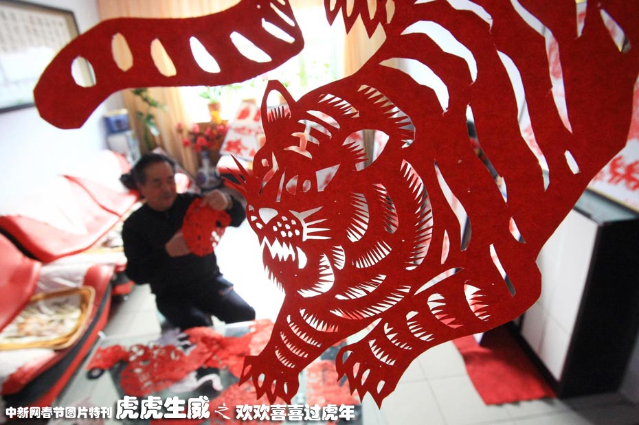 2月1日,已有56年剪紙經(jīng)驗的新疆奇臺縣71歲民間剪紙藝人李萬發(fā)正在家中精心剪裁各類虎圖案,準(zhǔn)備贈與親朋好友。中國農(nóng)歷新年即將到來,新疆各地以各種方式迎接農(nóng)歷虎年的到來。中新社發(fā) 劉新 攝