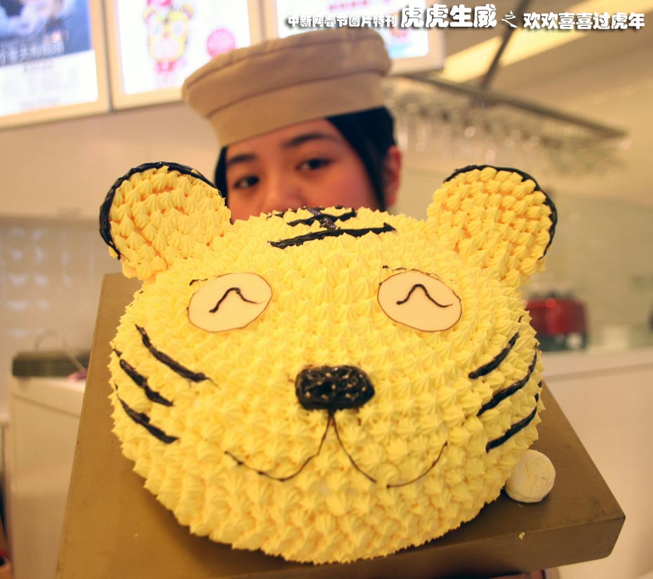 2月4日,浙江臺(tái)州市蛋糕店的點(diǎn)心師展示卡通虎臉蛋糕。中新社發(fā) 王天榮 攝