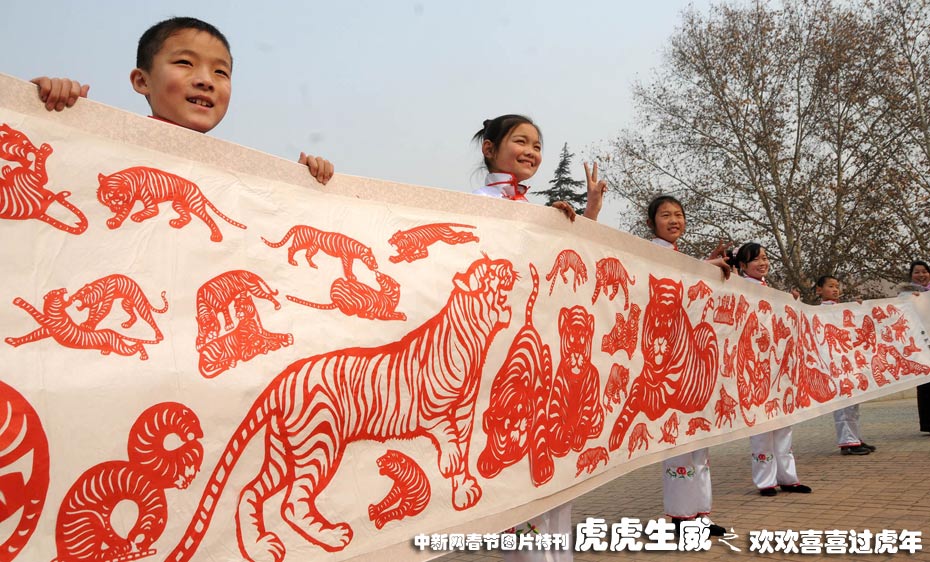 2月4日上午,洛陽市中州西路小學師生展示10米民間剪紙長卷《百虎爭春》圖。中新社發(fā) 張光輝. 攝