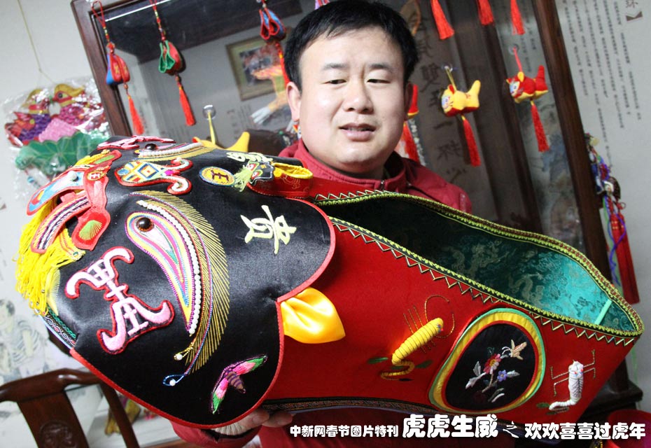 1月18日,南京民間藝人高勇與父母一起花費(fèi)三個(gè)月時(shí)間制作了一只長(zhǎng)80厘米、高35厘米的虎頭鞋,日前亮相南京市民俗博物館。據(jù)悉,改鞋共用絲綢3.5米,耗費(fèi)金絲線、絲線和棉線約750米。中新社發(fā) 阿董 攝