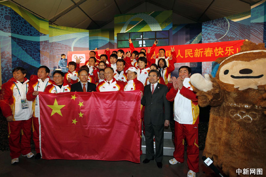當(dāng)?shù)貢r間2月10日,中國代表團在溫哥華冬奧會奧運村舉行升旗儀式。升旗儀式結(jié)束后,中國代表團團長劉鵬帶領(lǐng)代表團成員展開橫幅高聲向全體國人送上新春祝福。中新社記者 盛佳鵬 攝