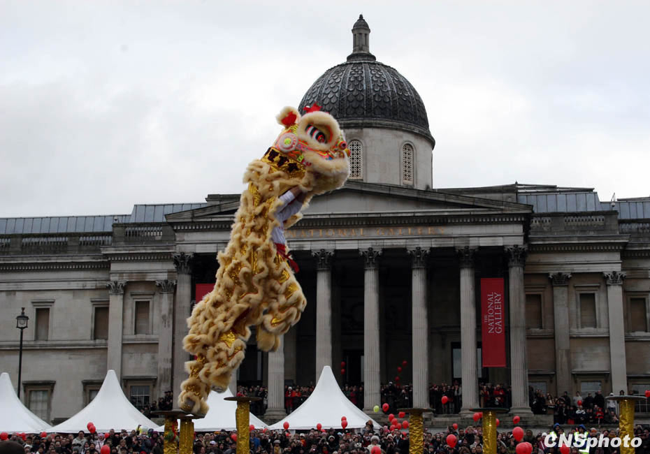 當(dāng)?shù)貢r(shí)間2月21日,亞洲之外最大規(guī)模的春節(jié)慶祝活動(dòng)——倫敦春節(jié)慶典在倫敦特拉法加廣場、萊斯特廣場及倫敦華埠舉行,圖為當(dāng)?shù)貎S社舞獅團(tuán)表演的“梅花樁”,令現(xiàn)場數(shù)萬觀眾發(fā)出驚嘆。 中新社發(fā) 魏群 攝