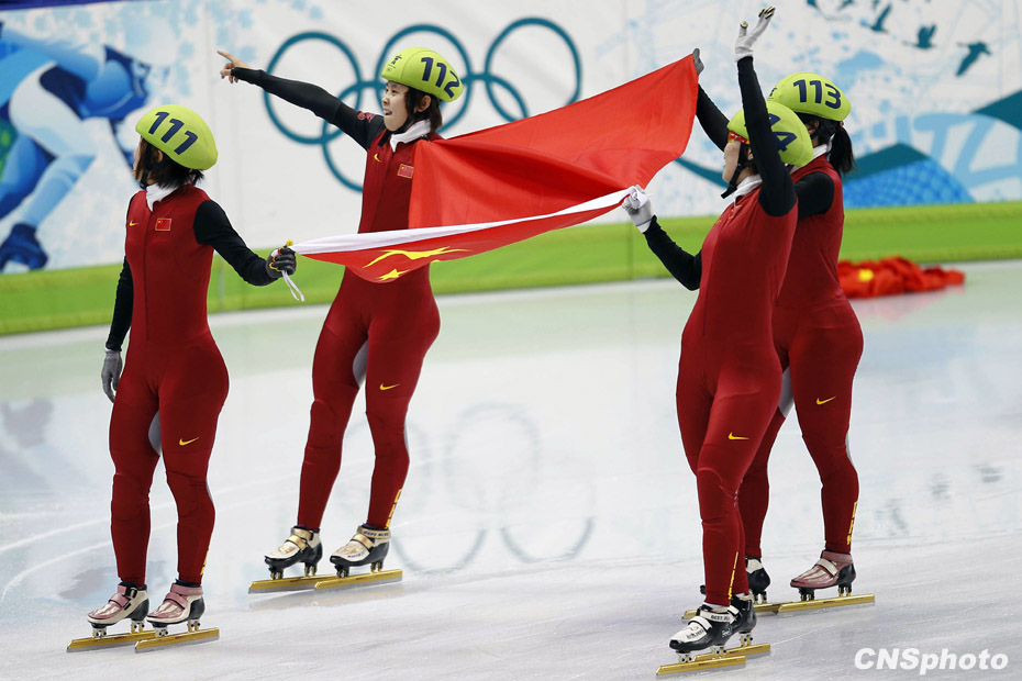 當(dāng)?shù)貢r(shí)間2月24日,溫哥華冬奧會(huì)女子短道速滑3000米接力A組決賽中,中國隊(duì)王濛、周洋、孫琳琳、張會(huì)四朵金花聯(lián)袂出擊,最終將金牌歸入中國隊(duì)囊中。圖片來源:中國新聞網(wǎng)