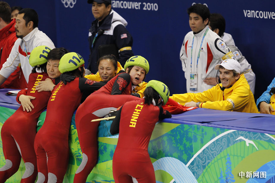 在裁判宣布韓國隊犯規(guī)后,一直等候著最終結(jié)果的中國姑娘忘情地?fù)湎蚪叹毾D片清楚地顯示,興奮的王濛撲到教練李琰前面寬寬的防護墊上,她的右腿無意間高高抬起,冰刀刮到了跟在她身后的張會的下巴。王濛意識到自己闖了禍,馬上關(guān)切地回頭察看張會的傷情。四位姑娘舉著國旗慶祝勝利時,張會用手捂著她的下巴,漸漸地鮮血浸濕了她的手套。