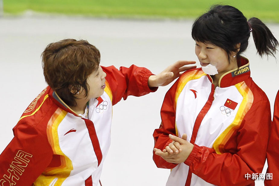 在裁判宣布韓國隊犯規(guī)后,一直等候著最終結(jié)果的中國姑娘忘情地撲向教練席。圖片清楚地顯示,興奮的王濛撲到教練李琰前面寬寬的防護墊上,她的右腿無意間高高抬起,冰刀刮到了跟在她身后的張會的下巴。王濛意識到自己闖了禍,馬上關(guān)切地回頭察看張會的傷情。四位姑娘舉著國旗慶祝勝利時,張會用手捂著她的下巴,漸漸地鮮血浸濕了她的手套。