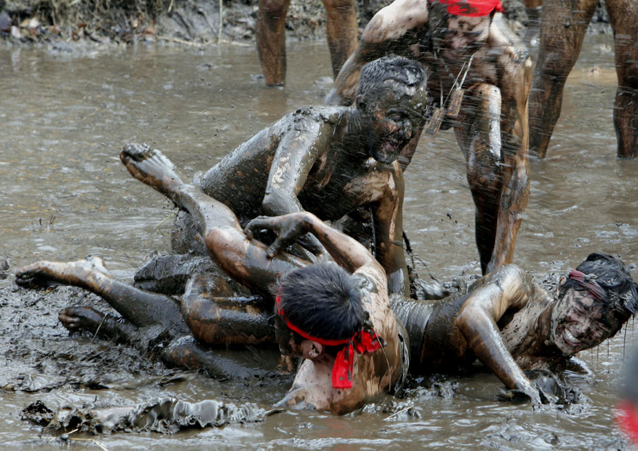 2月25日,在日本千葉縣四街道市郊外的稻田里,居民們參加一年一度的“泥漿節(jié)”。當(dāng)?shù)氐哪凶觽兂嗌硖M稻田,把泥漿涂抹在身上。人們希望通過這種儀式祈求新的一年能有個好收成。
