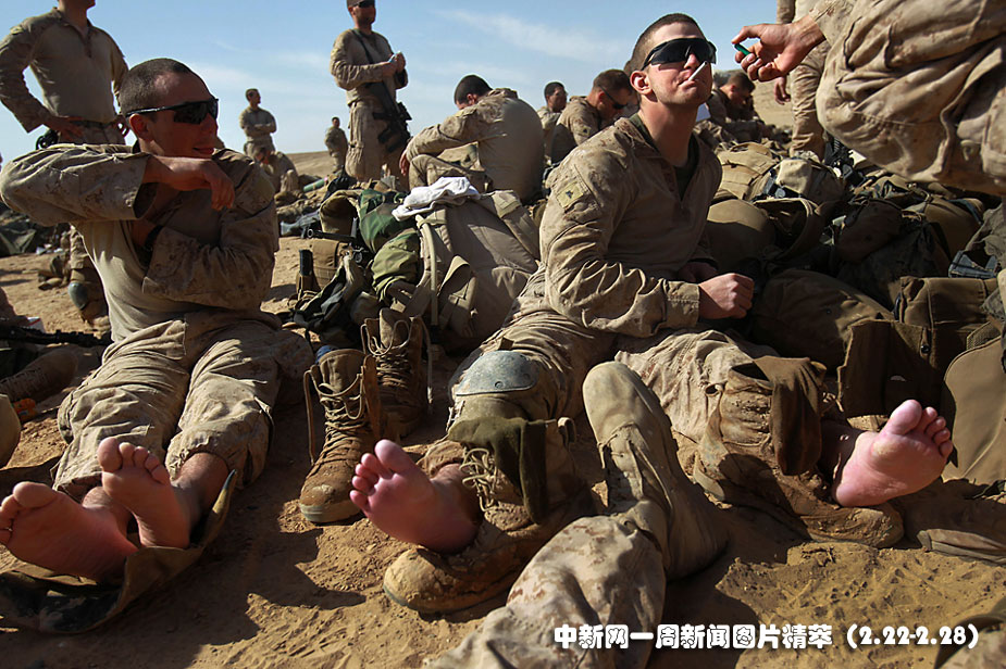 23日(周二),在阿富汗馬爾賈城,美軍陸戰(zhàn)隊士兵們在行動結束后坐下來休息。