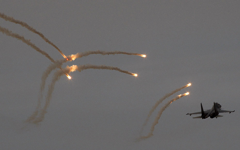2月28日,印度空軍在該國西部地區(qū)舉行大規(guī)?罩谢鹆φ故狙萘(xí),出動了包括“費(fèi)爾康”空中預(yù)警機(jī)、蘇-30戰(zhàn)斗機(jī)、米格-29戰(zhàn)斗機(jī)、幻影-2000戰(zhàn)斗機(jī)、伊爾-76運(yùn)輸機(jī)和米-35武裝直升機(jī)等約百架戰(zhàn)機(jī)。圖片來源:中國新聞網(wǎng)