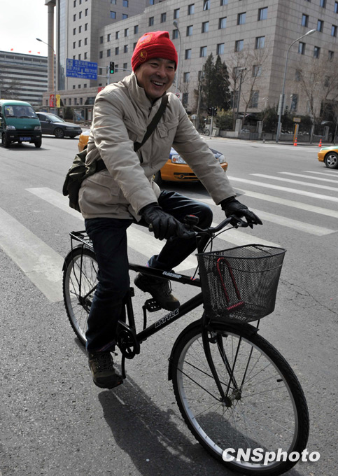 3月2日中午,全國(guó)政協(xié)委員濮存昕騎自行車去北京國(guó)際飯店,向十一屆政協(xié)三次會(huì)議會(huì)務(wù)組報(bào)到。中新社發(fā) 賈國(guó)榮 攝
