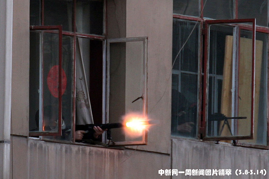 周四,甘肅蘭州,警方向槍殺特警嫌犯的藏匿點(diǎn)開火。當(dāng)天,轟動(dòng)全國(guó)的蘭州槍擊案嫌犯付曉霖被警方發(fā)現(xiàn),嫌犯躲進(jìn)一居民樓內(nèi)。雙方對(duì)峙長(zhǎng)達(dá)11個(gè)小時(shí),期間人質(zhì)被解救,最終特警破門進(jìn)入嫌犯所在屋內(nèi)將其擊斃。圖片來源:中國(guó)新聞網(wǎng)