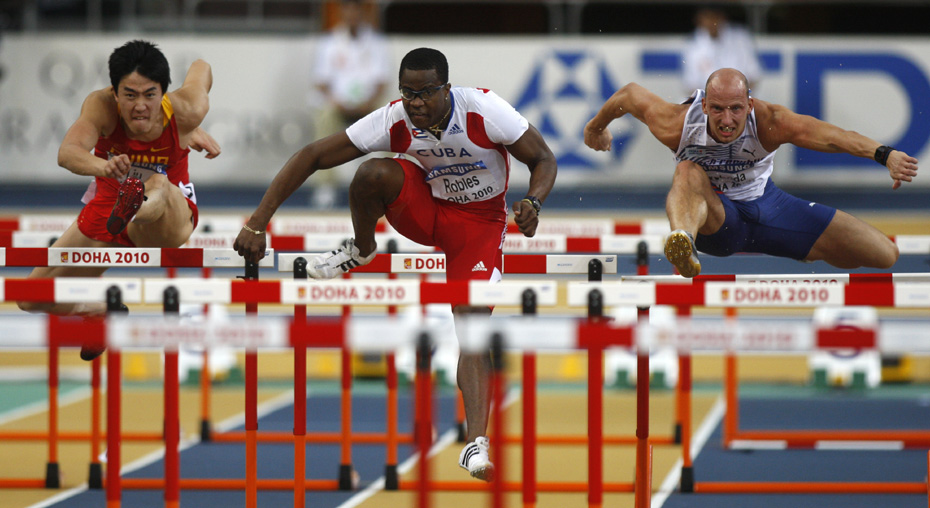 在14日晚間結(jié)束的多哈室內(nèi)田徑世錦賽60米欄決賽中,劉翔僅僅以7秒65的成績(jī)獲得第七名。古巴選手羅伯斯則以7秒34成績(jī)奪得冠軍并打破室內(nèi)世錦賽賽會(huì)紀(jì)錄。圖片來(lái)源:中國(guó)新聞網(wǎng)