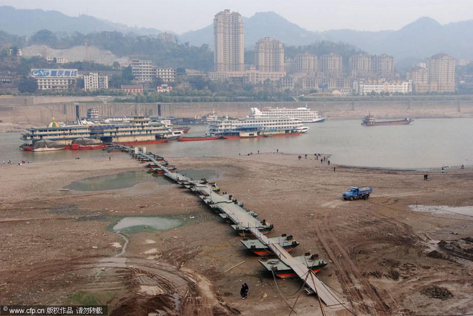 3月13日,長(zhǎng)江重慶朝天門段裸露的河灘。受西南地區(qū)干旱和三峽水庫騰庫影響,長(zhǎng)江重慶段水位持續(xù)走低,給通航安全帶來影響。劉洋/CFP